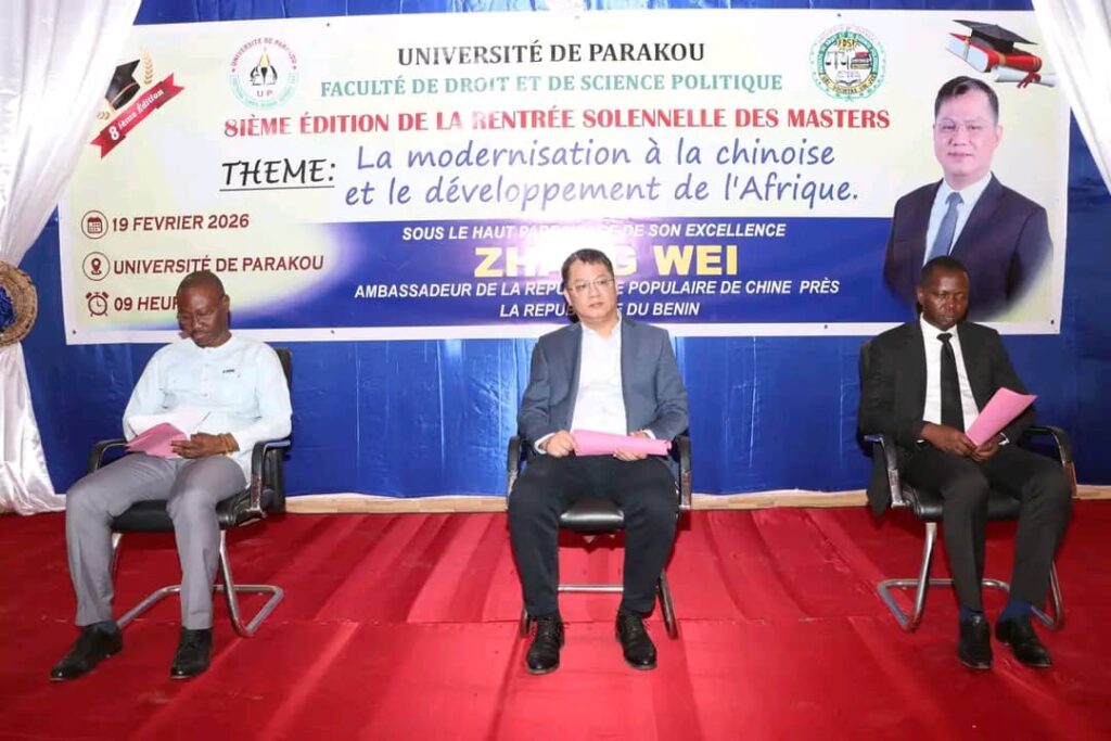 Le jeudi 19 février 2026 s’est tenue, dans l’amphithéâtre B de l’Université de Parakou (Up), la 8ᵉ édition de la rentrée solennelle des masters de la Faculté de Droit et de Science Politique (Fdsp). Placée sous le thème : « La modernisation à la chinoise et le développement de l’Afrique », elle a connu la présence de plusieurs cadres et autorités. Entre autres, l’ambassadeur de la République populaire de Chine près le Bénin, Zhang Wei, le recteur de l’Up, Professeur Bertrand Sogbossi Bocco, le doyen de la Fdsp, Professeur Moktar Adamou, le représentant du Chef d’État-Major Général des Forces armées béninoises, Jean Olou. Le Secrétaire général adjoint du gouvernement, Cyrille Gougbedji, les vice-recteurs de l’Up et bien d’autres.