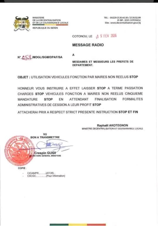 Le Ministre de la Décentralisation et de la Gouvernance Locale, Raphaël Akotegnon, a pris une décision importante concernant les maires non réélus de la cinquième mandature. Dans un message radio adressé aux préfets de départements le 19 février 2026, il a ordonné de laisser les véhicules de fonction à la disposition de ces maires dès la fin de la passation de charges.