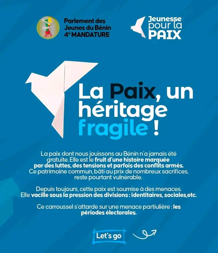 À quelques mois des élections générales de 2026, le Parlement des Jeunes du Bénin (PJB) a lancé une initiative majeure pour préserver la cohésion nationale : le projet « Jeunesse pour la Paix » en période électorale. C’est une campagne digitale axée sur la promotion de la paix avant, pendant et après les élections.