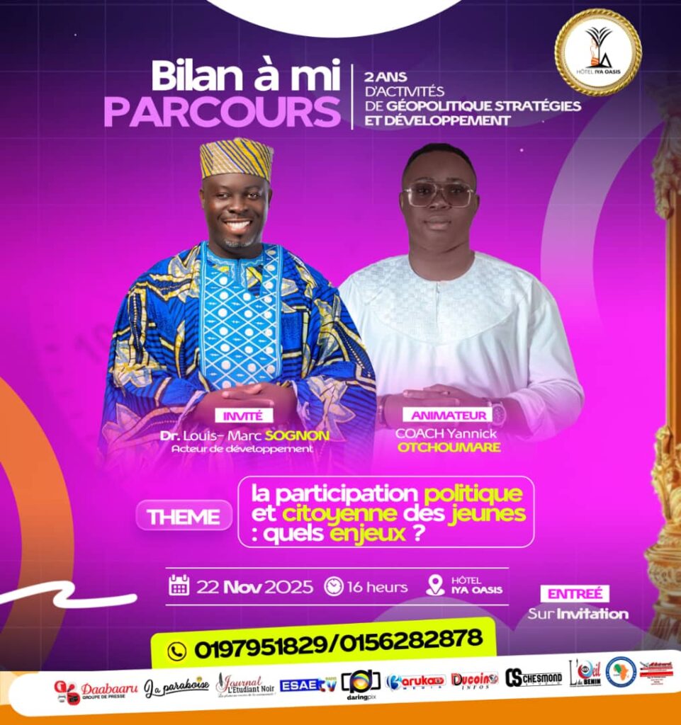 L’hôtel Iya-Oasis de Parakou abritera, le 22 novembre 2025 aux environs de 16 heures, une séance d’envergure consacrée au bilan à mi-parcours des activités de Géopolitique, Stratégie et Développement, initiées et animées depuis deux ans par le Coach Yannick Otchoumare. Ces rencontres se sont imposées comme une véritable plateforme d’analyse et de propositions au service des décideurs, chercheurs, leaders d’opinion, acteurs du changement et d’engagement collectif.