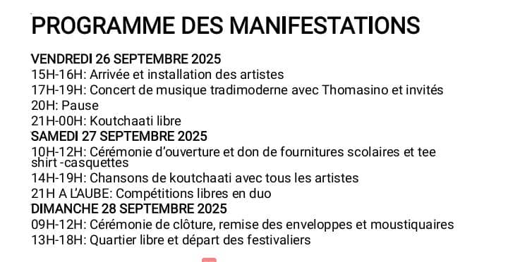 - 26 septembre : arrivée et installation des artistes, musique tradimoderne avec Thomasino et Koutchaati