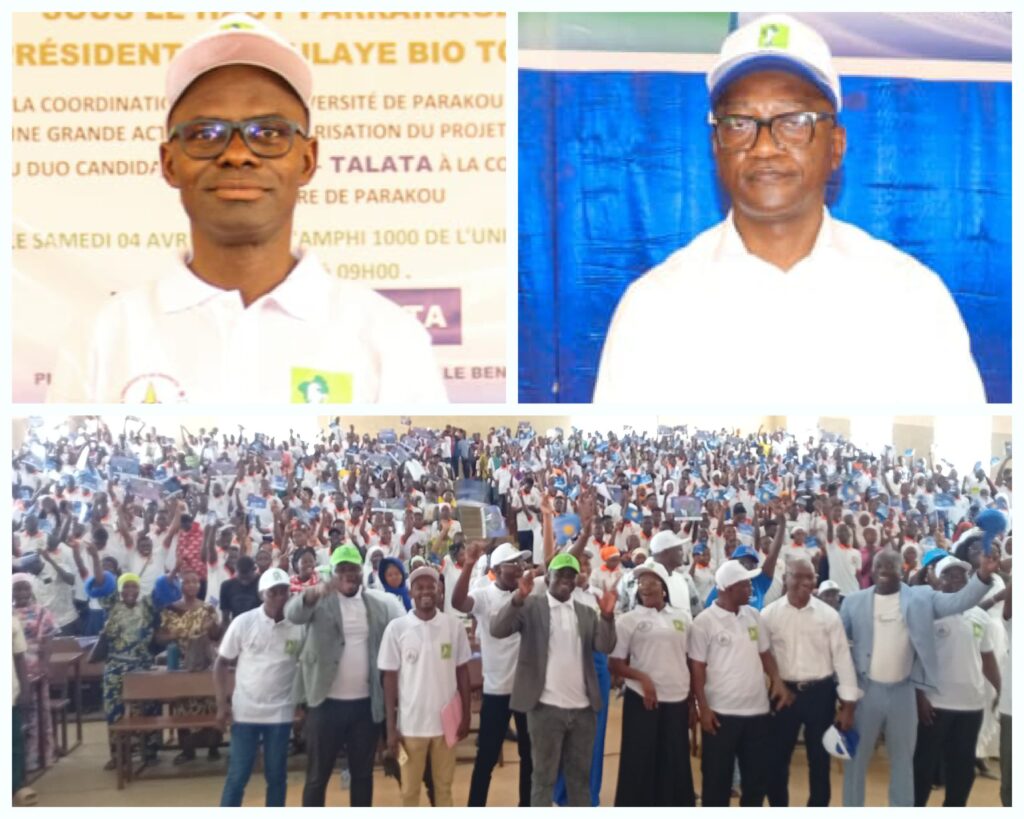 Le temps fort de cette mobilisation a eu lieu le samedi 4 avril à l’Université de Parakou, avec une grande séance de vulgarisation du projet de société du duo Wadagni-Talata à la communauté universitaire. Plus de 5 000 étudiants, venus des quatre communes de la 8e C.E, y ont pris part. La combinaison de prises de parole pédagogiques et d’animations culturelles a renforcé l’adhésion d’une large partie de la jeunesse. Le soutien public de responsables d’amphithéâtres, d’associations estudiantines et de plusieurs enseignants a amplifié la dynamique en faveur du duo Wadagni-Talata.