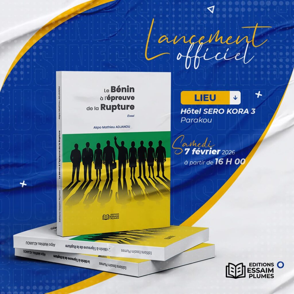 Les Éditions Essaim Plumes annoncent le lancement officiel de l’essai “Le Bénin à l’épreuve de la Rupture”. Écrit par Akpo Mathieu Adjanou, le lancement de ce chef-d’œuvre aura lieu le samedi 7 février 2026 à l’Hôtel Sero Kora 3 de Parakou.