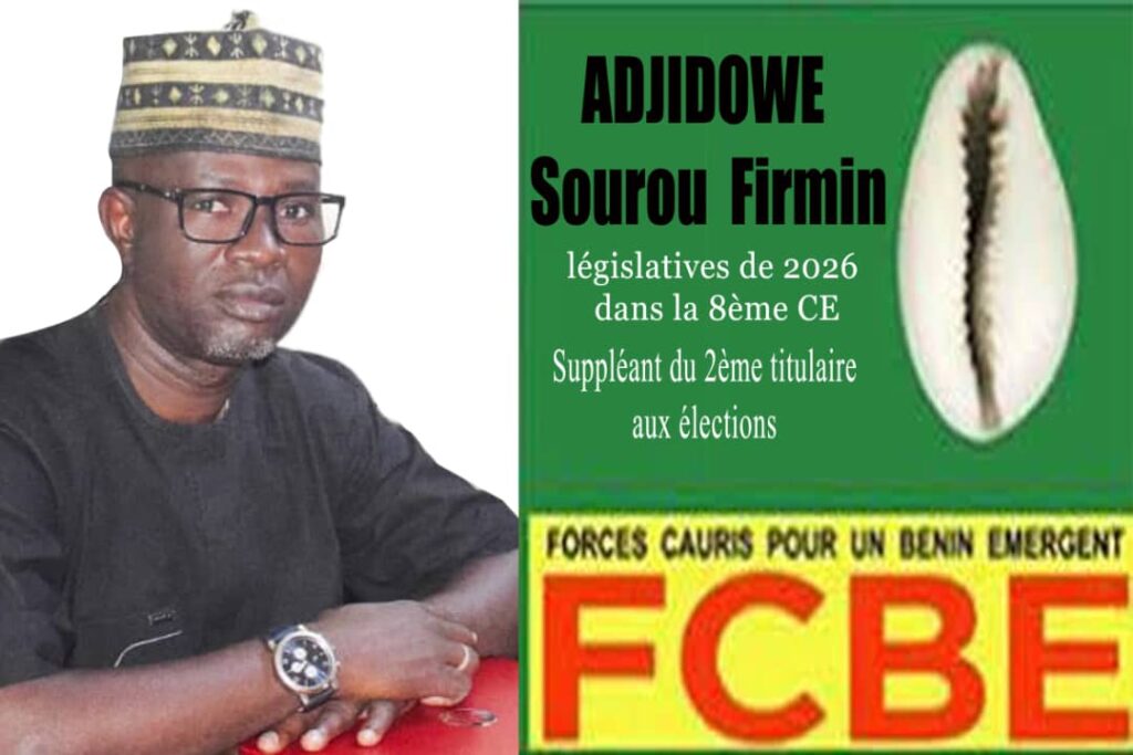Firmin Sourou Adjidowe, est un jeune leader politique qui très influent dans la huitième Circonscription Électorale. Il a été désigné par son parti politique, Force Cauris pour un Bénin Émergeant (Fcbe) pour être le suppléant du deuxième titulaire dans le cadre des élections législatives du 11 janvier 2026.