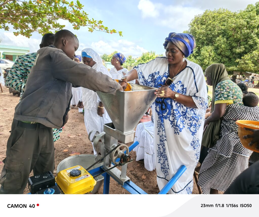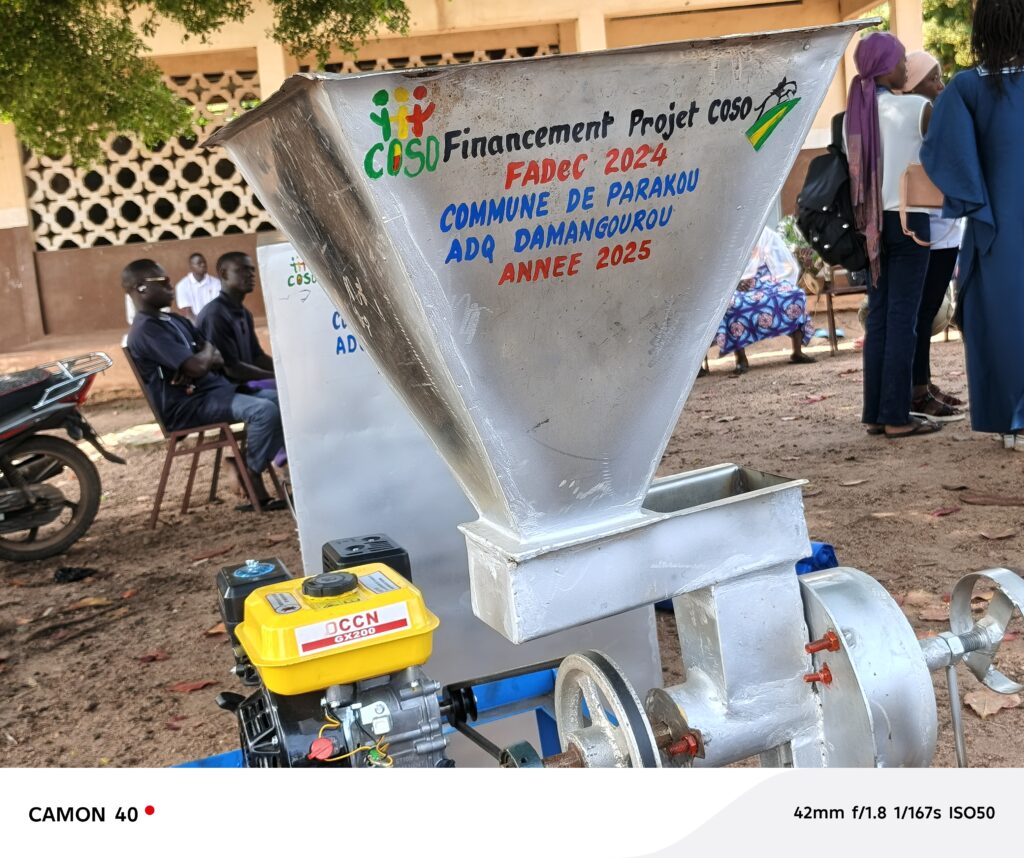 Raïnath Kégnidé, facilitatrice technicienne du projet Coso, a rappelé que les femmes elles-mêmes ont défini les équipements dont elles avaient besoin. « Nous avons recueilli leurs demandes dès le départ. Aujourd’hui, nous leur remettons un moulin à soja, une presse pour extraire le jus, une malle d’archivage pour les documents, et une bâche pour le séchage du son », a-t-elle expliqué.