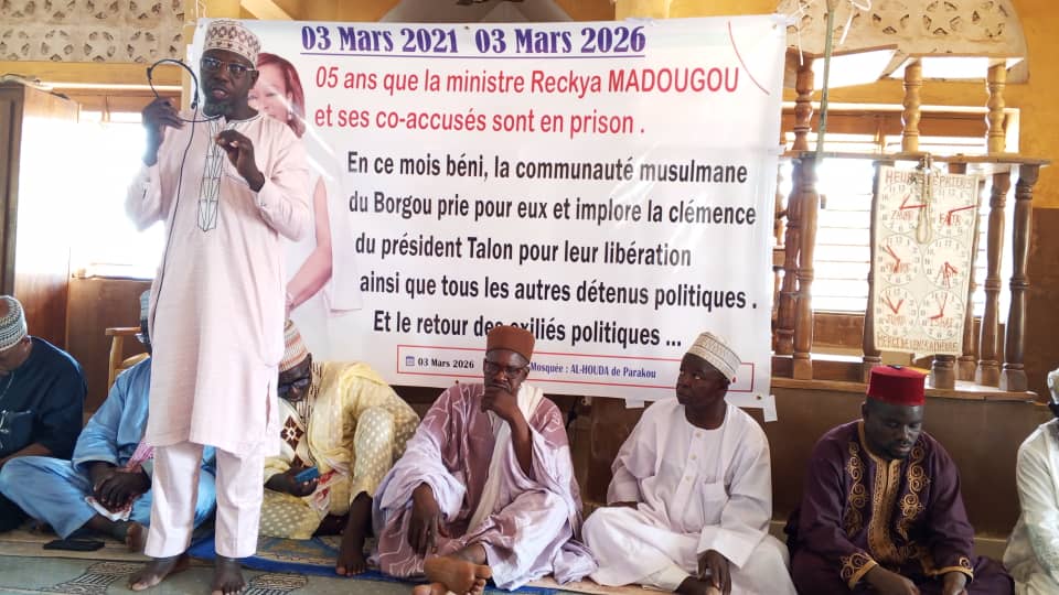 La communauté musulmane du Borgou s’est réunie ce mardi 03 mars 2026 à la grande Mosquée Al Houda de Parakou pour une séance de prière en faveur des détenus politiques et des exilés. Cette initiative, organisée à l’occasion du 5e anniversaire de l’arrestation de l’ancienne ministre Reckya Madougou et de ses co-accusés, vise à implorer la clémence du Chef de l’État, Patrice Talon.