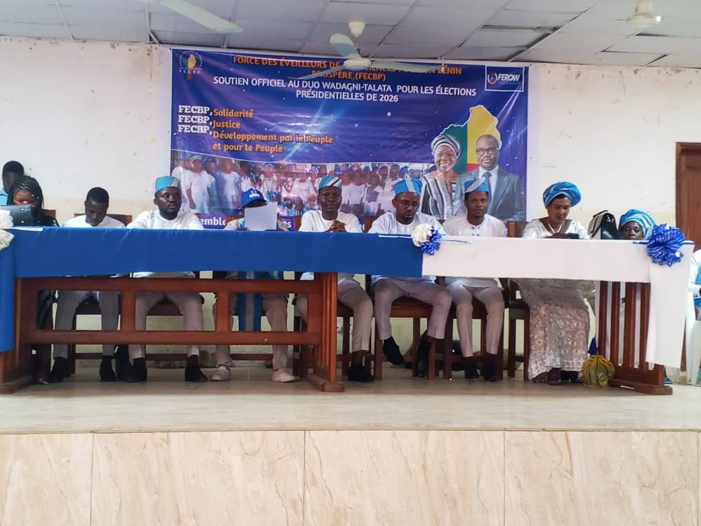 Réunis à Abomey-Calavi, le Samedi 8 Novembre 2025, les leaders et les sympathisants du mouvement Force des Éveilleurs de Consciences pour un Bénin Prospère (Fecbp) ont solennellement déclaré leur soutien au duo présidentiel ” Romuald Wadagni et Mariam Talata Chabi Zimé “. Dans une ambiance de ferveur et d’unité, les différents réseaux du mouvement (réseau des étudiants et scolaires, réseau des artisans, réseau des femmes) et les fédérations locales ont réaffirmé leur engagement à accompagner ce duo qu’ils jugent porteur d’espoir pour la jeunesse et pour le développement de notre cher pays, le Bénin.