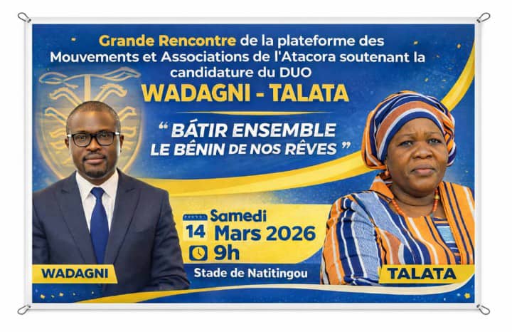 La Plateforme soutenant Romuald Wadagni et Mariam Chabi Talata organise une grande rencontre de ralliement des mouvements et associations engagés en faveur du duo le 14 Mars 2026 au stade omnisports de Natitingou, dans le département de l’Atacora. Cette initiative vise à fédérer les forces sociales et citoyennes du département autour d’une même dynamique politique et à renforcer la mobilisation en perspective des échéances électorales de 2026.